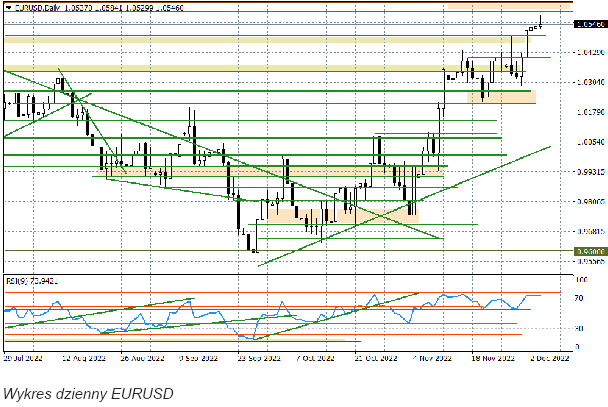 Rynek chyba woli to jednak zweryfikować przy okazji publikacji komunikatu i nowych projekcji makro ze strony FED, co będzie mieć miejsce 14 grudnia. Wcześniej poznamy jednak wiele istotnych danych: ISM dla usług (dzisiaj), inflację PPI (piątek), inflację CPI (wtorek przed FED), chociaż trudno ocenić, na ile mogłyby one zmienić trend na dolarze. W piątek po danych z rynku pracy powróciły oczekiwania, co do sufitu dla stóp procentowych w maju 2023 r. na poziomie 5,00-5,25 proc., ale dzisiaj rano były one już słabsze. Niezależnie od faktu, że zdaniem wpływowego dziennikarza Wall Street Journal (Timiraos) istnieje ryzyko, że FED podniesie stopy procentowe w 2023 r. ponad poziom 5 proc.