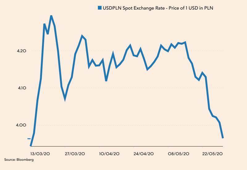 Ciekawe jest to, jak rynki kompletnie ignorują złe wiadomości. Faktem jest, że są też pozytywy. W Europie Zachodniej pandemia przygasa i nie widać na razie istotnych negatywnych skutków luzowania restrykcji, a to oznacza zielone światło dla kolejnych kroków. Tym niemniej, koniunktura gospodarcza nadal pozostawia wiele do życzenia a napływające dane wskazują raczej na powolne wychodzenie z kryzysu. Spadek postrzeganego ryzyka przez rynki oznacza, że inwestorzy uciekają od bardzo drogiego dolara, a to zaczyna w końcu istotniej pomagać złotemu i niweluje niekorzystny wpływ obniżki stóp procentowych.