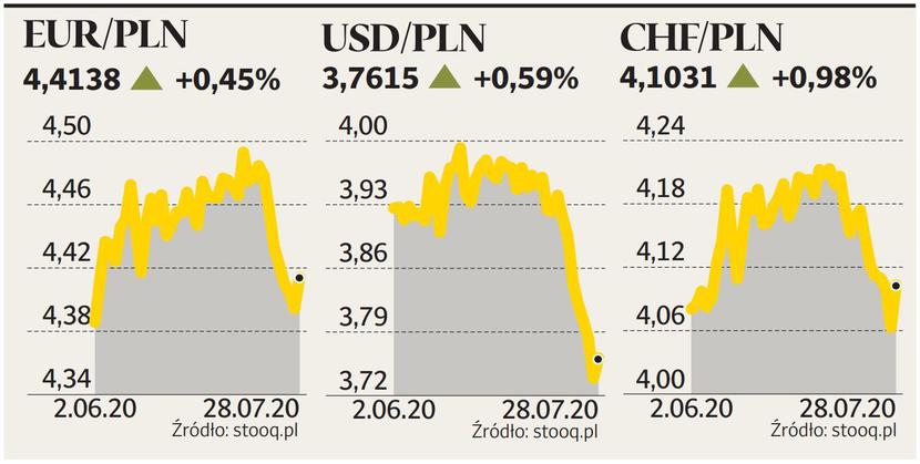 W kraju dolar we wtorek przez chwilę był poniżej 3,73 zł. Kilka godzin później notowania były już 4 grosze wyżej. Euro ustabilizowało się ponad barierą 4,40 zł, po wcześniejszej nieudanej próbie jej naruszenia. Sentyment wokół złotego tradycyjnie pozostaje silnie powiązany z tym, co dzieje się na kursie EUR/USD. A to nie tylko dolar, ale też euro. Euforia po szczycie UE już mija, a rynki powinny się przygotować na wzrost zakażeń COVID-19 w Europie w najbliższych tygodniach, co może zaważyć na tempie ożywienia gospodarki.