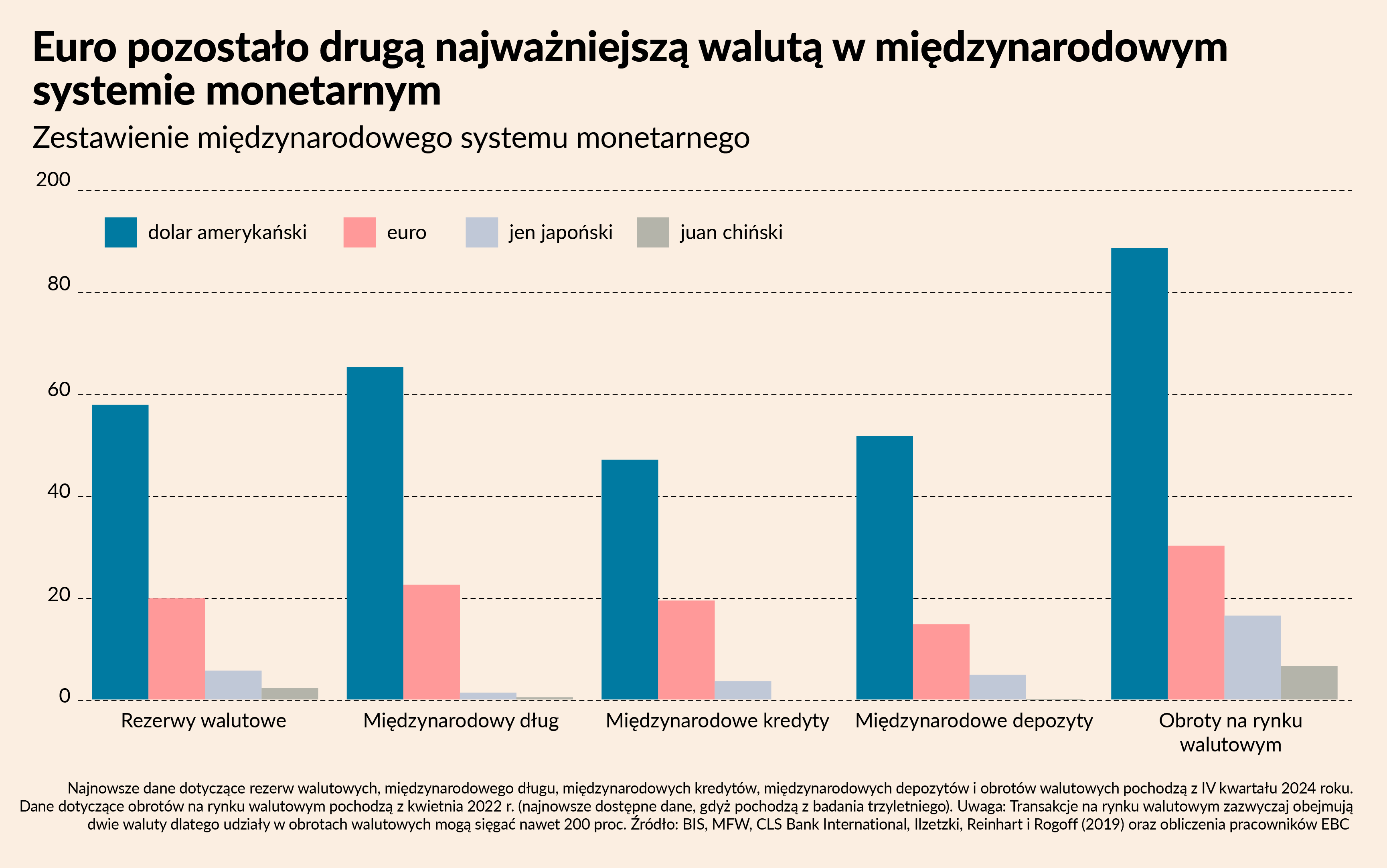 Według raportu EBC udział dolara w globalnych rezerwach w 2024 roku spadł o 2 punkty procentowe, ale największymi beneficjentami tego trendu były jen japoński oraz dolar kanadyjski, a nie euro. Europejska waluta zanotowała jedynie niewielki wzrost, a jej udział utrzymał się tuż poniżej 20 proc. Dolar natomiast wciąż dominuje z 58 proc. udziału, chociaż to o 10 punktów procentowych mniej niż jeszcze dekadę temu.