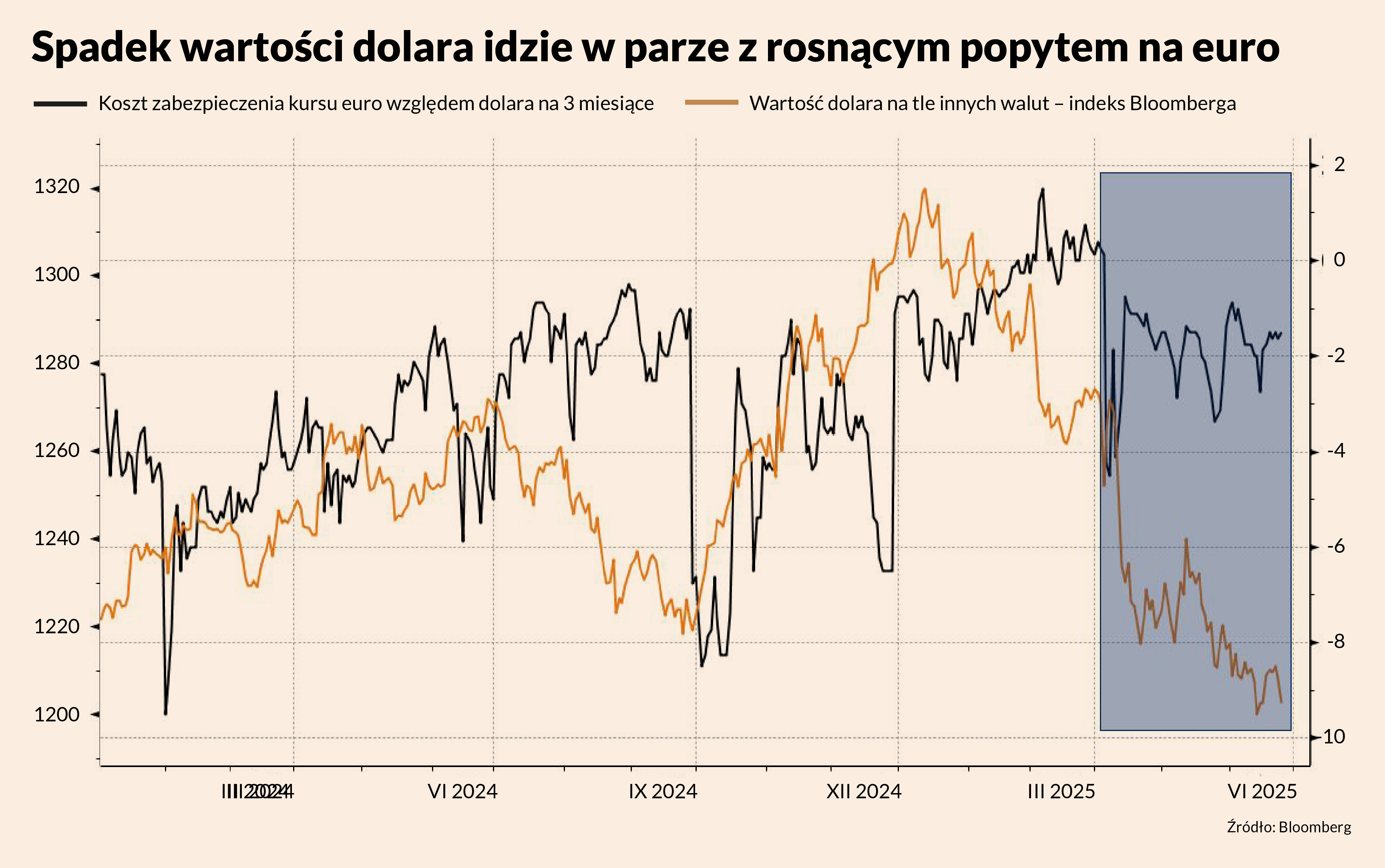 W ciągu ostatnich trzech lat inwestorzy stopniowo płacą coraz mniej za dostęp do dolarów. Pokazuje to wskaźnik mierzący koszt długoterminowej wymiany euro na dolara, którego wartość rośnie. To sygnał, że dolar traci na atrakcyjności i przestaje być traktowany jako waluta pierwszego wyboru. Co ciekawe, nawet przy rosnących napięciach geopolitycznych – jak niedawne ataki USA i Izraela na Iran – nie obserwuje się typowej reakcji rynku, czyli ucieczki kapitału w stronę dolara.