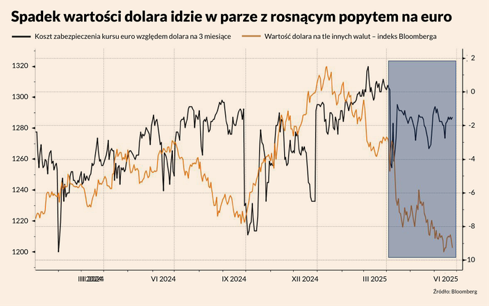 Bloomberg Dollar Spot Index, który śledzi wartość dolara względem koszyka globalnych walut, spadł od początku roku o ponad 8 proc. To najsłabszy początek roku w ponad 20-letniej historii indeksu. W tym samym czasie koszt zabezpieczania transakcji w euro wzrósł, co sugeruje przesuwanie się kapitału z USA do Europy.