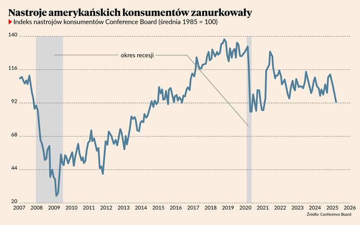 Jeden z dwóch najważniejszych indeksów nastrojów amerykańskich konsumentów zanotował w marcu znaczący spadek. Indeks Conference Board obniżył się o 7,2 pkt do 92,9 pkt. W tym badaniu, które powstaje na podstawie comiesięcznych ankiet, ważny jest nie tyle bezwzględny poziom indeksu, co jego wartość w relacji do trendów historycznych. Obecny odczyt jest wyraźnie poniżej średniej z ostatnich lat i jednocześnie najniżej od początku 2021 r., czyli od momentu, kiedy USA dopiero wchodziły w okres ożywienia po pandemii. Co jeszcze ciekawsze, subindeks oczekiwań, mierzący przewidywania dotyczące przyszłej sytuacji finansowej Amerykanów i ich prognozy dotyczące gospodarki, spadł do najniższego poziomu od 13 lat.