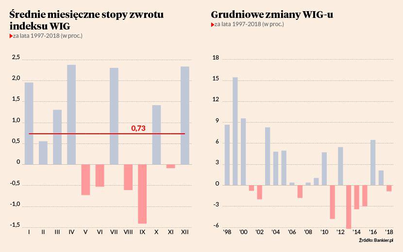 Statystycznie grudzień jest jednym z najlepszych miesięcy na GPW. W latach 1998- -2018 przeciętna grudniowa stopa zwrotu z WIG wyniosła 2,33 proc. To ciut lepiej niż w lipcu (2,3 proc.) i tylko nieznacznie gorzej niż w najlepszym pod tym względem kwietniu (2,37 proc.). Dobra reputacja grudnia bierze się też z jego łagodności: najniższa (po 1997 r.) grudniowa stopa zwrotu WIG wyniosła -6,3 proc. Lepsze osiągi pod tym względem ma jedynie marzec (-5,4 proc.). W przypadku większości innych miesięcy zdarzały się straty przekraczające 10 proc., a nawet 20 proc.