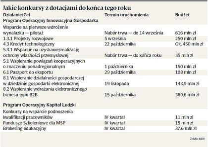Wakacje się kończą — i pojawiają się kolejne szanse na unijne dofinansowanie. Jeszcze w tym roku przedsiębiorcy będą mieli kilkanaście okazji, by otrzymać zastrzyk gotówki z Brukseli. Warto spróbować, bo ten i następny rok to już ostatnie konkursy w ramach obecnej perspektywy finansowej 2007-13. W kolejnej będzie znacznie mniej dotacji — zastąpi je wsparcie zwrotne, np. pożyczki. Najwięcej pieniędzy czeka na firmy w Programie Operacyjnym Innowacyjna Gospodarka (POIG).