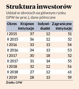 To o 1 pkt proc. więcej niż w drugiej połowie 2018 r. Karty rozdają wciąż inwestorzy zagraniczni, których udział to 59 proc. (rekord z poprzedniego półrocza to 61 proc.). Nieco pola odzyskały krajowe instytucje (udział wzrósł z 27 do 28 proc.), przy czym pierwszy raz od czterech lat najwięcej obrotów wygenerowali animatorzy rynku, a nie TFI.