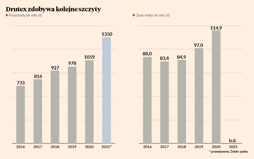 Zeszły rok Drutex zamknął ze sprzedażą przekraczającą 1,059 mld zł. Był to wzrost o 8,3 proc. w stosunku do wyniku z 2019 r. Zysk netto wyniósł prawie 115 mln zł.
