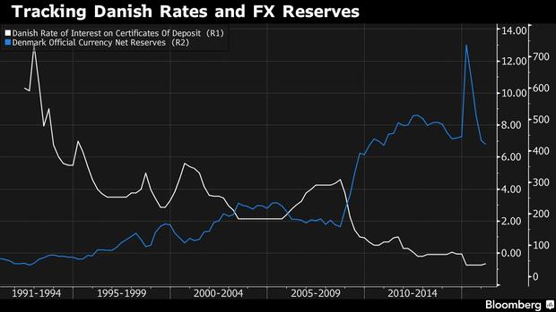 Bank centralny Danii wykorzystuje politykę monetarną, aby utrzymać odpowiedni kurs korony do euro (przed euro była to marka niemiecka). W ubiegłym roku prezes banku centralnego Lars Rohde obniżył referencyjną stopę depozytową do minus 0,75 proc., gromadząc rezerwy walutowe, dopóki nie stanowiły około 40 proc. produktu krajowego brutto.