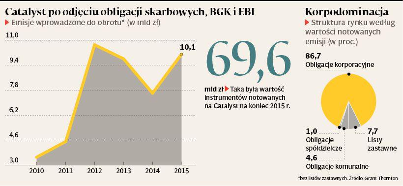 Dwaj ostatni emitenci reprezentują najliczniejsze branże wśród przedsiębiorstw obecnych na giełdowym rynku papierów dłużnych Catalyst — usługi finansowe i deweloperów. To, co było charakterystyczne dla Catalyst w 2015 r., to mniejsza liczba debiutów, ale o większej wartości. Pomijając papiery skarbu państwa, BGK i EBI, które stanowią niemal 89 proc. wartości notowanych instrumentów, na rynek trafiły obligacje o wartości ponad 10 mld zł, co zdarzyło się tylko w rekordowym 2012 r. Stało się m.in. to za sprawą takich dużych emitentów, jak Tauron, Enea, Cyfrowy Polsat czy Raiffeisen Bank Polska.
