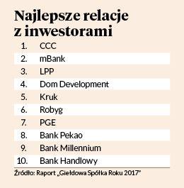 — Oczekiwania były takie, że przejmę w całości kwestie związane z relacjami inwestorskimi, ale wcale nie było to takie proste. Przez pierwsze pół roku jeździłem z wiceprezesem Piotrem Nowjalisem na wszystkie spotkania, konferencje, road show, by poznać firmę. Zarządzania relacjami inwestorskimi nie da się przejąć z dnia na dzień — wspomina Bartłomiej Piekarski. Efekty zmiany uwidoczniły się dość szybko. W 2016 r. CCC zajęło w kategorii relacji inwestorskich siódme miejsce. W 2017 r. było już najlepsze.