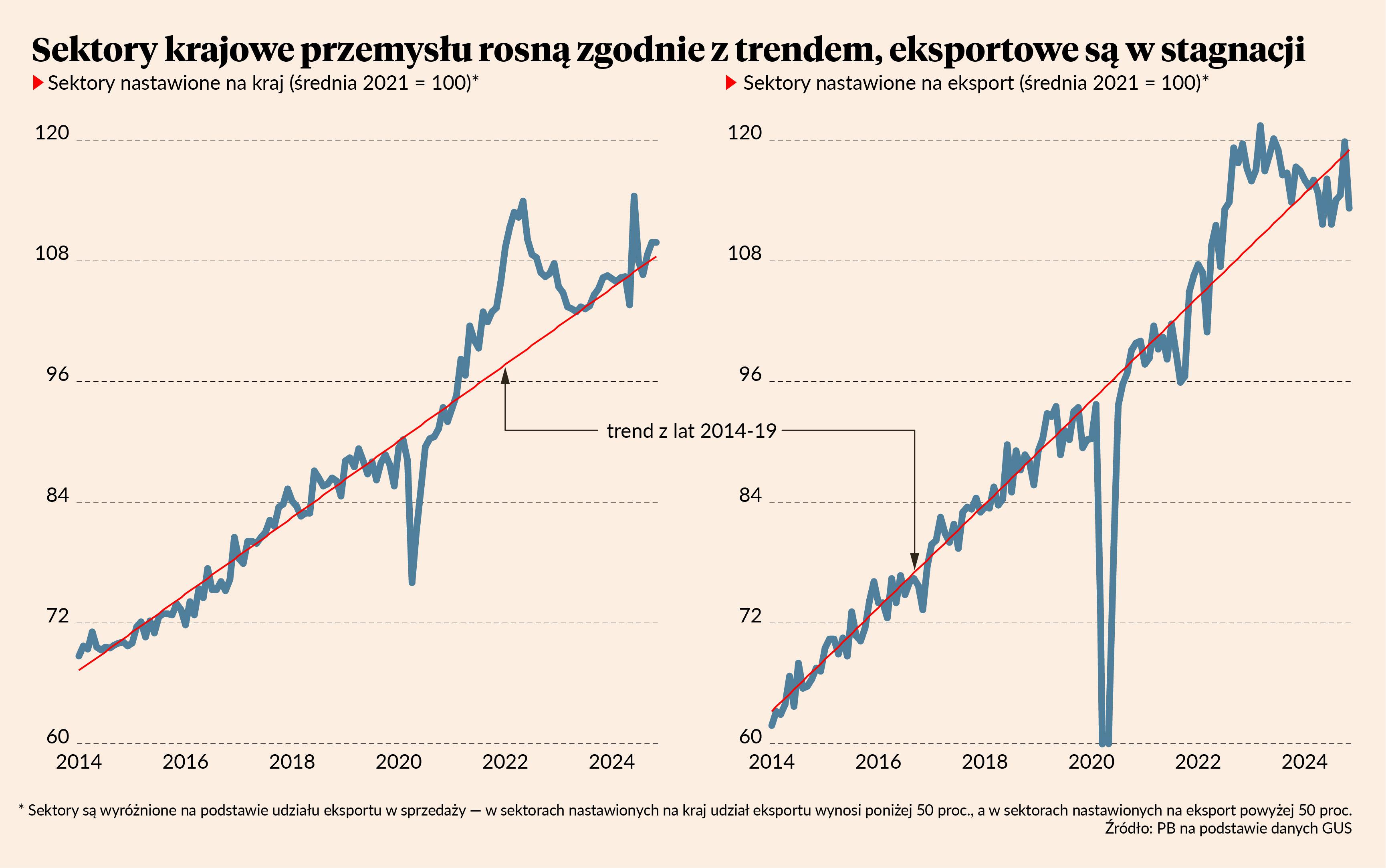 W ujęciu zagregowanym tradycyjnie nie widać różnic między sektorami, a one są nadzwyczaj istotne w obecnym cyklu. Utrzymuje się istotna różnica między sektorami nastawionymi na sprzedaż krajową a tymi nastawionymi na eksport. W pierwszych produkcja rośnie w średnim tempie 3 proc., a w drugich spada w średnim tempie 1 proc. Do pierwszej grupy należy m.in. sektor spożywczy, przetwórstwo drewna i papieru, przemysł poligraficzny, chemia, farmacja, materiały budowlane i metale. W drugiej grupie, tej eksportowej, znajdują się m.in. producenci elektroniki, urządzeń AGD i maszyn elektrycznych, meble, sprzęt transportowy oraz motoryzacja.
