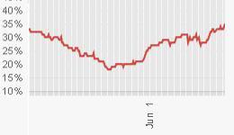 Kształtowanie się prawdopodobieństwa zwycięstwa zwolenników brexitu w rozpisanym na 23 czerwca referendum, obliczanego głównie na podstawie notowań bukmacherów, w ciągu ostatniego miesiąca. Źródło: Predictwise.com.