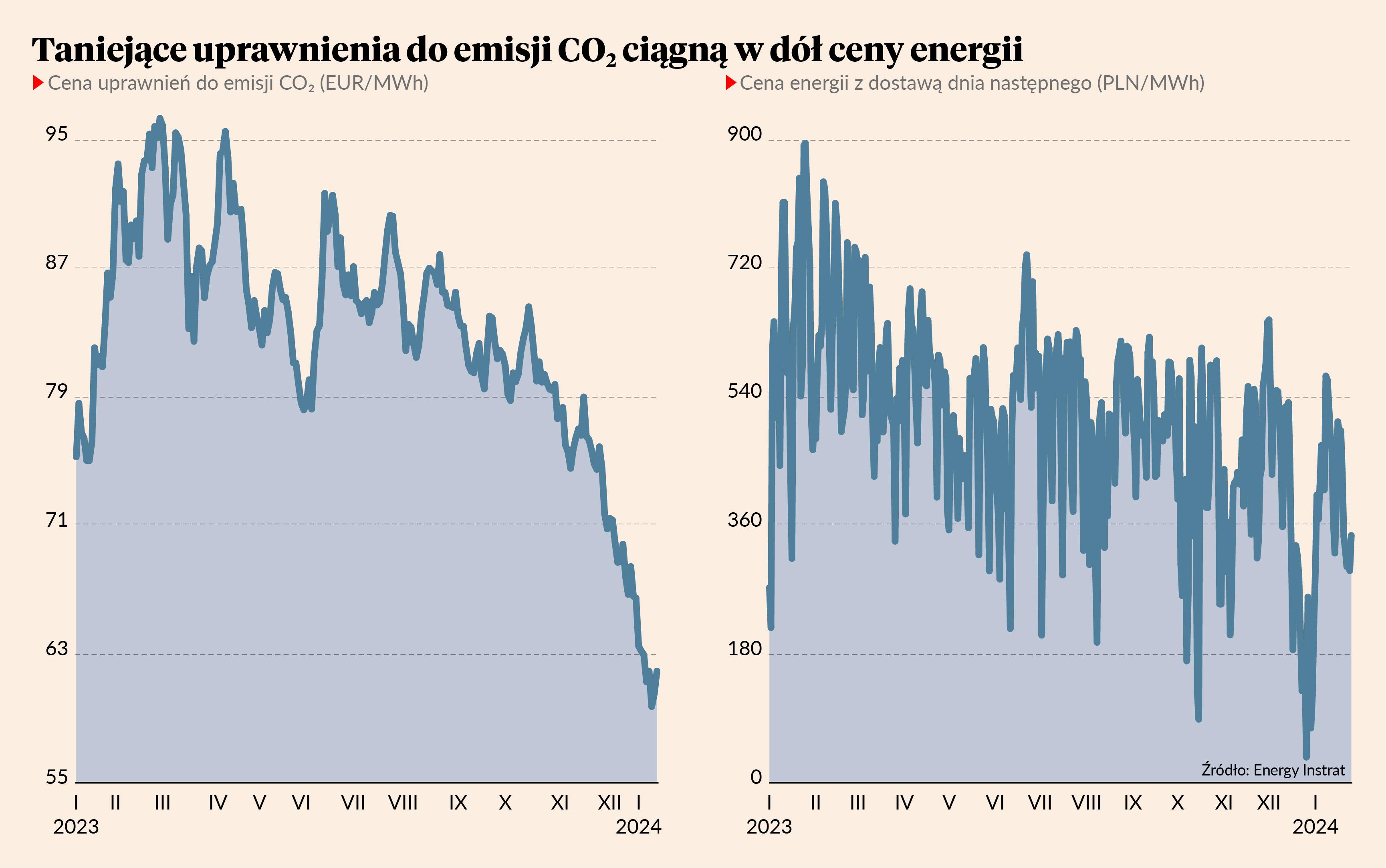 Choć wydawało się, że za uprawnienia do emisji CO2 będzie trzeba płacić coraz więcej, a trwałe przebicie 100 EUR za emisję jednej tony to kwestia czasu, to od dziewięciu miesięcy cena systematycznie spada. W styczniu 2024 r. zbliżyła się nawet do 60 EUR, czyli najniższego poziomu od 2021 r. Przekłada się to także na cenę energii, która z poziomów przekraczających 600 zł/MWh na początku poprzedniego roku w grudniu zeszła poniżej 400 zł/MWh. I choć w styczniu nieco odbiła, to nie zapowiada się, aby miała być znacznie droższa.