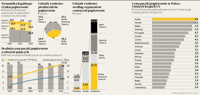 W 2012 r., według danych Ministerstwa Finansów, dochody z akcyzy na wyroby tytoniowejeszcze rosły, aż ostatecznie sięgnęły 18,6 mld zł. Choć były wyższe o 1,7 proc. od tych z 2011 r., nie udało się uzyskać kwoty zaplanowanej w ustawie budżetowej. Zabrakło 51 mln zł. Autorzy raportu „Praktyczne aspekty opodatkowania podatkiem akcyzowym wyrobów tytoniowych” tłumaczą, że, pierwsze sygnały o kłopotach z uzyskaniem zaplanowanych dochodów z akcyzy od papierosów pojawiły się w drugiej połowie 2012 r. W trzecim kwartale wyniosły one 4,82 mld zł i były o 3,4 proc. niższe w porównaniu z tym samym okresem 2011 r.
