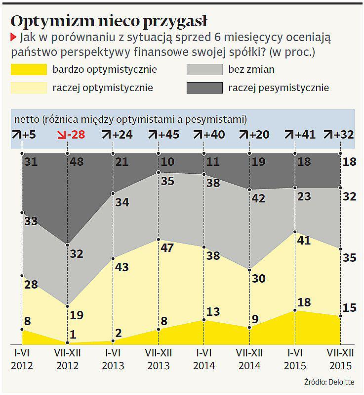 — To wiąże się prawdopodobnie w większym stopniu z niepewną sytuacją geopolityczną, a w mniejszym z obawami o stan polskiej gospodarki — podkreśla Krzysztof Pniewski, partner w dziale konsultingu Deloitte. Dzisiaj spokój menedżerów mącą obawy o chińską gospodarkę, wciąż duża niepewność w Eurolandzie oraz kryzys migracyjny.