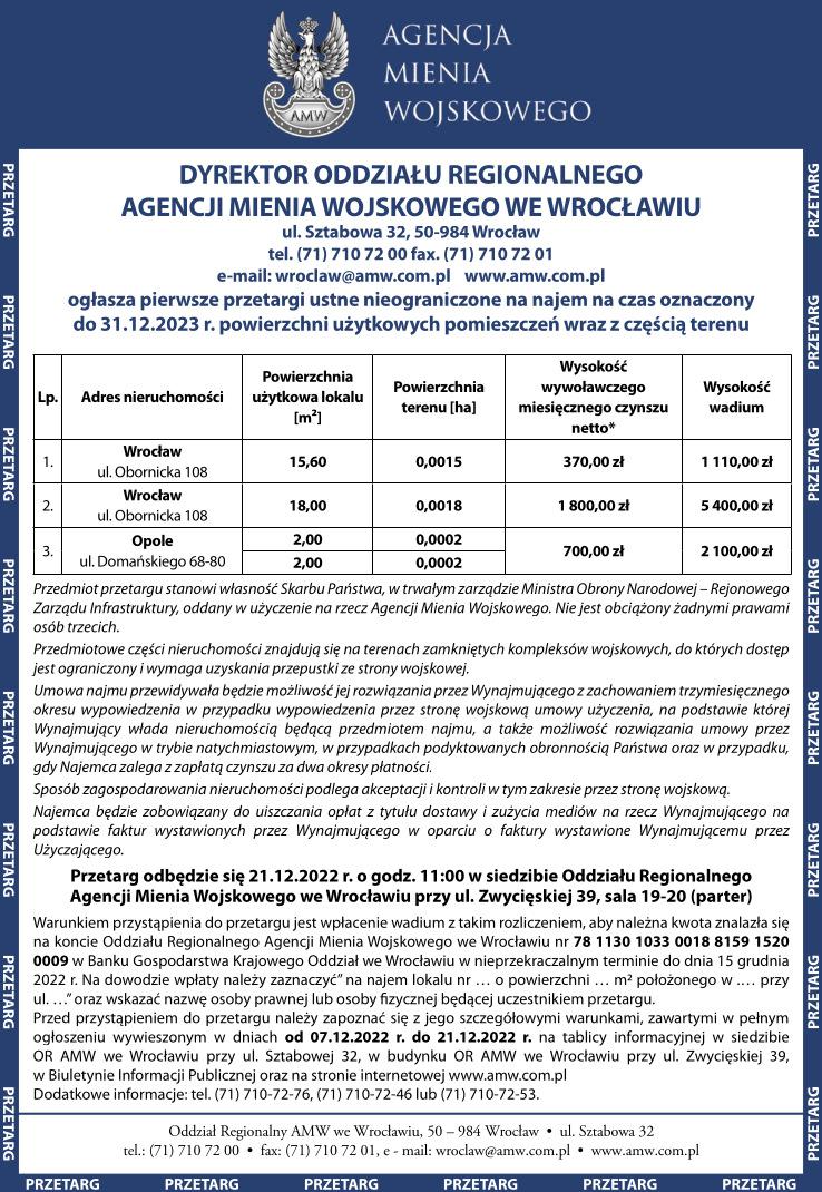 DYREKTOR ODDZIAŁU REGIONALNEGO AGENCJI MIENIA WOJSKOWEGO WE WROCŁAWIU Komunikat partneraopublikowano: 2022-12-06 14:32PosłuchajZostań subskrybentemi słuchaj tego oraz wielu innych artykułów w pb.pl