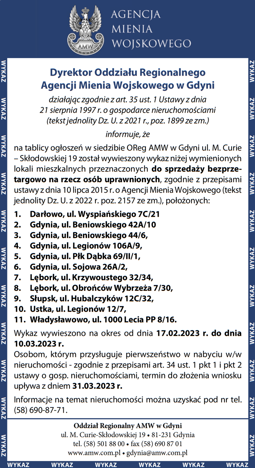 Dyrektor Oddziału Regionalnego AMW w Gdyni informuje, że na tablicy informacyjnej, wywieszony został wykaz Komunikat partneraopublikowano: 2023-02-16 15:00PosłuchajZostań subskrybentemi słuchaj tego oraz wielu innych artykułów w pb.pl