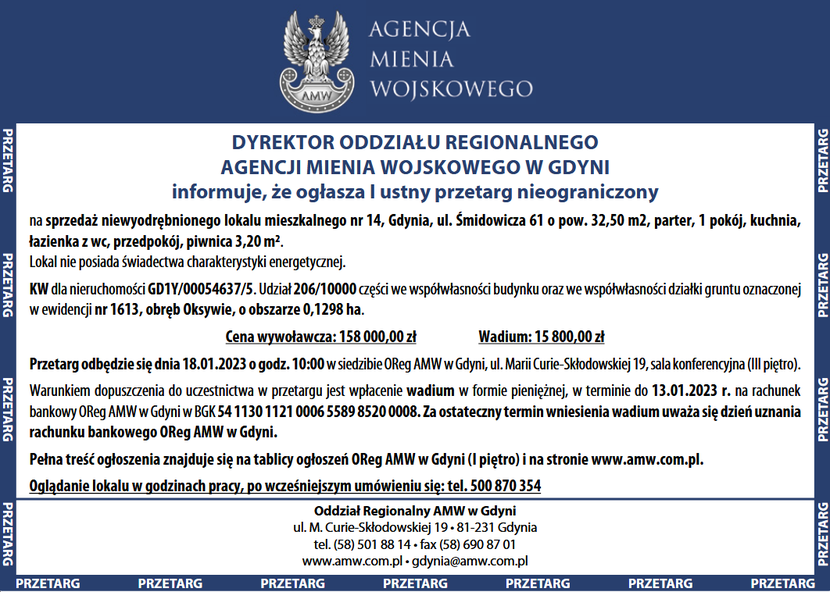 Dyrektor Oddziału Regionalnego AMW w Gdyni informuje, że ogłasza I ustny przetarg nieograniczony Komunikat partneraopublikowano: 2022-12-15 13:22PosłuchajZostań subskrybentemi słuchaj tego oraz wielu innych artykułów w pb.pl