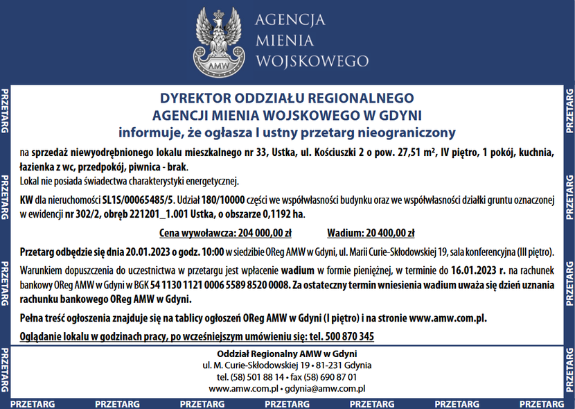 Dyrektor Oddziału Regionalnego AMW w Gdyni informuje, że ogłasza ustny przetarg nieograniczony Komunikat partneraopublikowano: 2022-12-16 14:31PosłuchajZostań subskrybentemi słuchaj tego oraz wielu innych artykułów w pb.pl