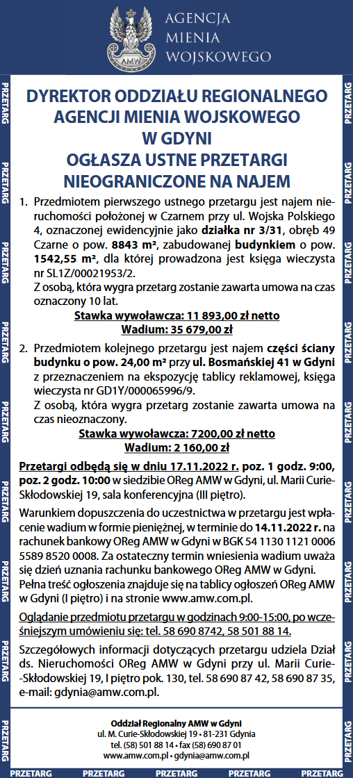 Dyrektor Oddziału Regionalnego AMW w Gdyni informuje, że ogłasza ustny przetarg nieograniczony na najem Komunikat partneraopublikowano: 2022-11-02 15:02PosłuchajZostań subskrybentemi słuchaj tego oraz wielu innych artykułów w pb.pl