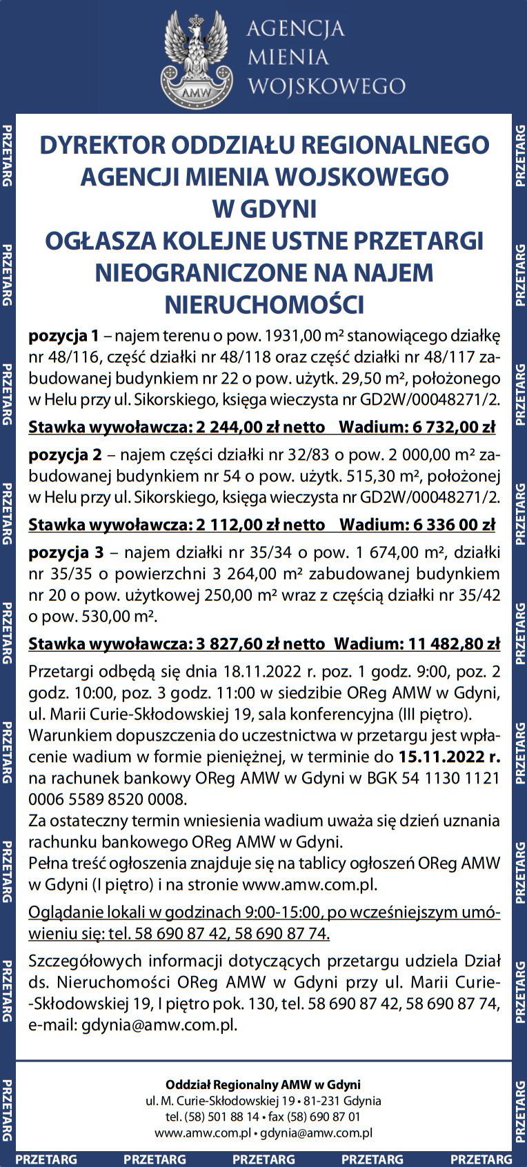 Dyrektor Oddziału Regionalnego AMW w Gdyni ogłasza kolejne ustne przetargi nieograniczone na najem nieruchomości Komunikat partneraopublikowano: 2022-11-03 13:01PosłuchajZostań subskrybentemi słuchaj tego oraz wielu innych artykułów w pb.pl