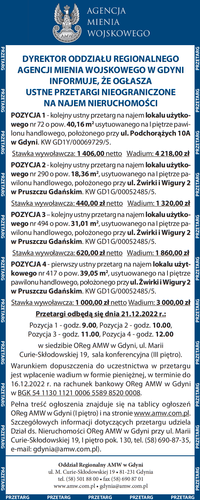 Dyrektor Oddziału Regionalnego AMW w Gdyni ogłasza kolejne ustne przetargi nieograniczone na najem nieruchomości Komunikat partneraopublikowano: 2022-12-05 16:00PosłuchajZostań subskrybentemi słuchaj tego oraz wielu innych artykułów w pb.pl