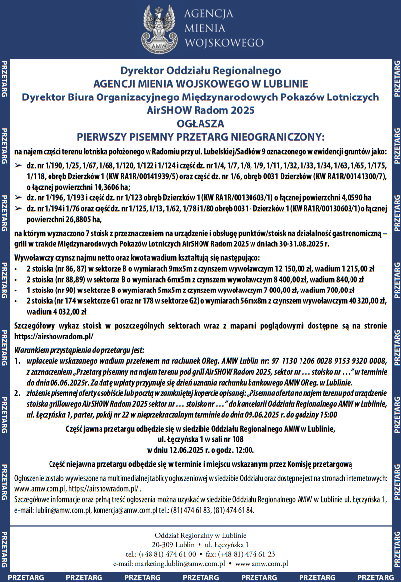 Dyrektor Oddziału Regionalnego AMW w Lublinie ogłasza pierwszy ustny przetarg nieograniczony Komunikat partneraopublikowano: 2025-05-27 13:51.PosłuchajZostań subskrybentemi słuchaj tego oraz wielu innych artykułów w pb.pl FOT.