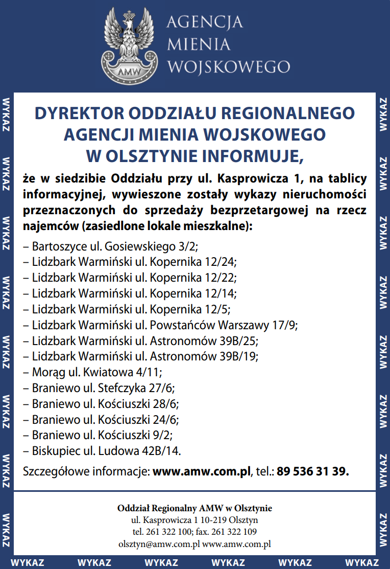 Dyrektor Oddziału Regionalnego AMW w Olsztynie informuje, że na tablicy informacyjnej, wywieszone zostały wykazy nieruchomości przeznaczonych do sprzedaży bezprzetargowej Komunikat partneraopublikowano: 2021-04-23 12:31