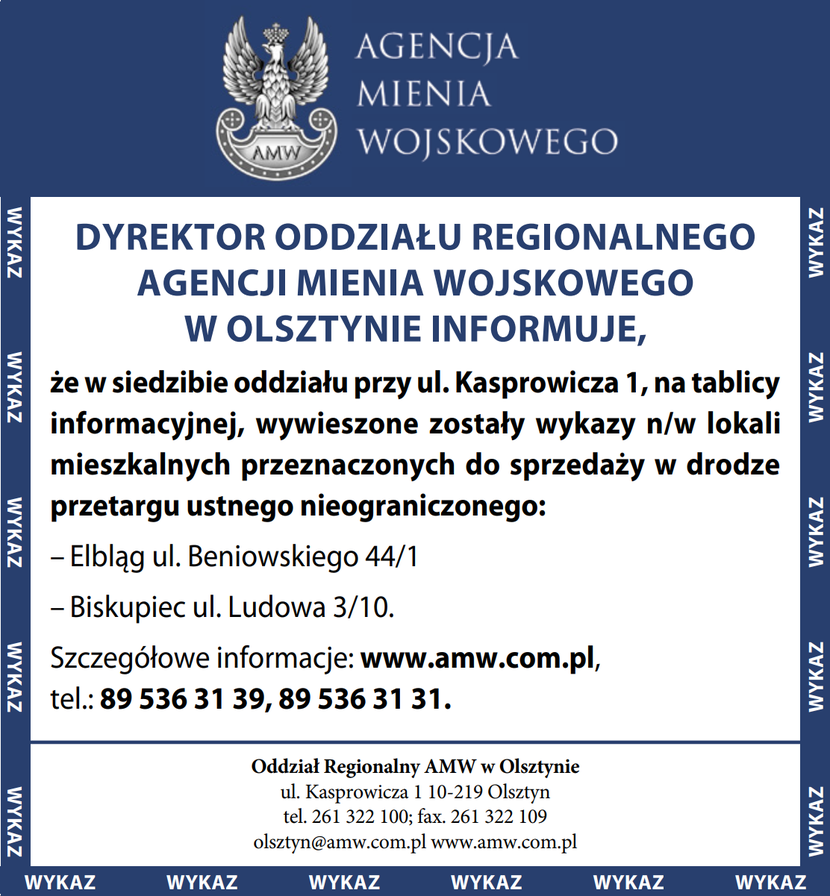 Dyrektor Oddziału Regionalnego AMW w Olsztynie informuje, że na tablicy informacyjnej, wywieszony został wykaz Komunikat partneraopublikowano: 2021-05-20 12:51