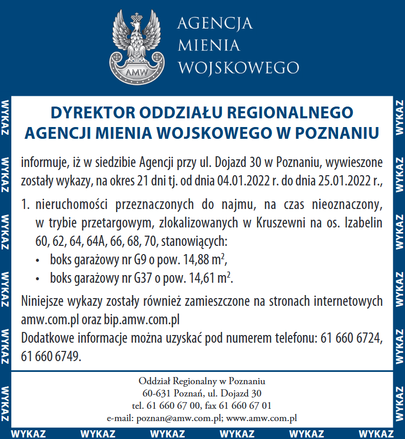 Dyrektor Oddziału Regionalnego AMW w Poznaniu informuje, że na tablicy informacyjnej, wywieszone zostały wykazy Komunikat partneraopublikowano: 2022-01-03 14:21