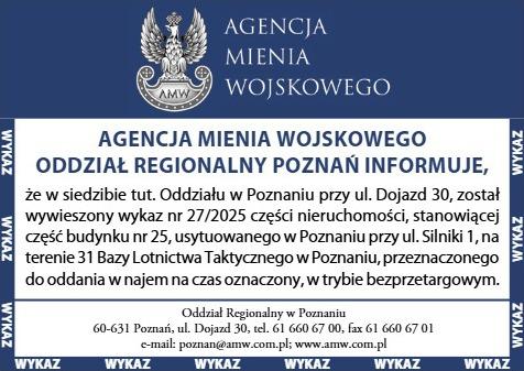 Dyrektor Oddziału Regionalnego AMW w Poznaniu informuje, że na tablicy informacyjnej, wywieszony został wykaz Komunikat partneraopublikowano: 2025-12-18 15:43.PosłuchajZostań subskrybentemi słuchaj tego oraz wielu innych artykułów w pb.pl FOT.