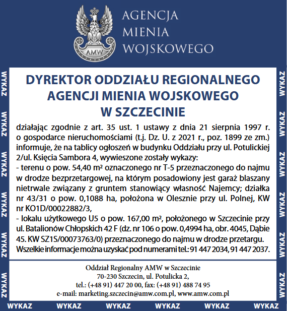 Dyrektor Oddziału Regionalnego AMW w Szczecinie informuje, że na tablicy informacyjnej, wywieszone zostały wykazy Komunikat partneraopublikowano: 2022-11-30 11:47PosłuchajZostań subskrybentemi słuchaj tego oraz wielu innych artykułów w pb.pl