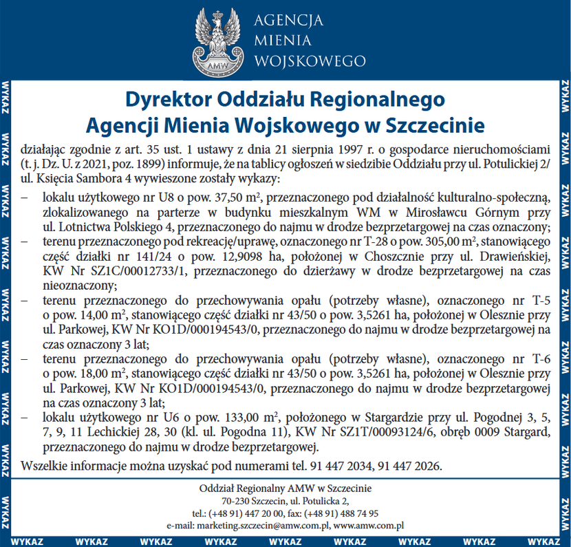 Dyrektor Oddziału Regionalnego AMW w Szczecinie informuje, że na tablicy informacyjnej, wywieszone zostały wykazy Komunikat partneraopublikowano: 2022-12-05 16:07PosłuchajZostań subskrybentemi słuchaj tego oraz wielu innych artykułów w pb.pl