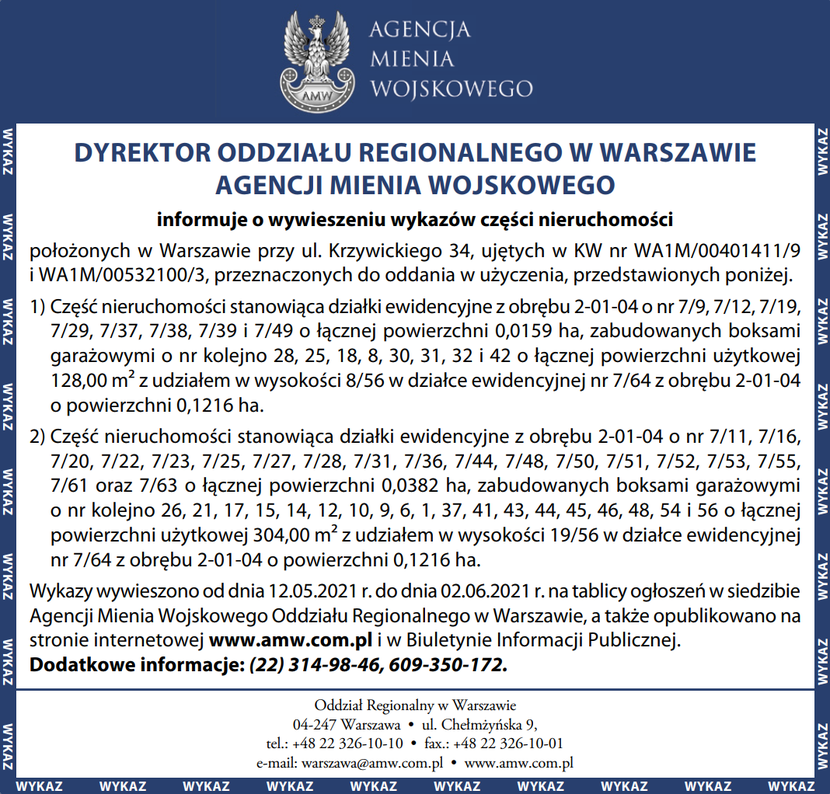 Dyrektor Oddziału Regionalnego AMW w Warszawie informuje o wywieszeniu wykazów części nieruchomości Komunikat partneraopublikowano: 2021-05-11 12:41