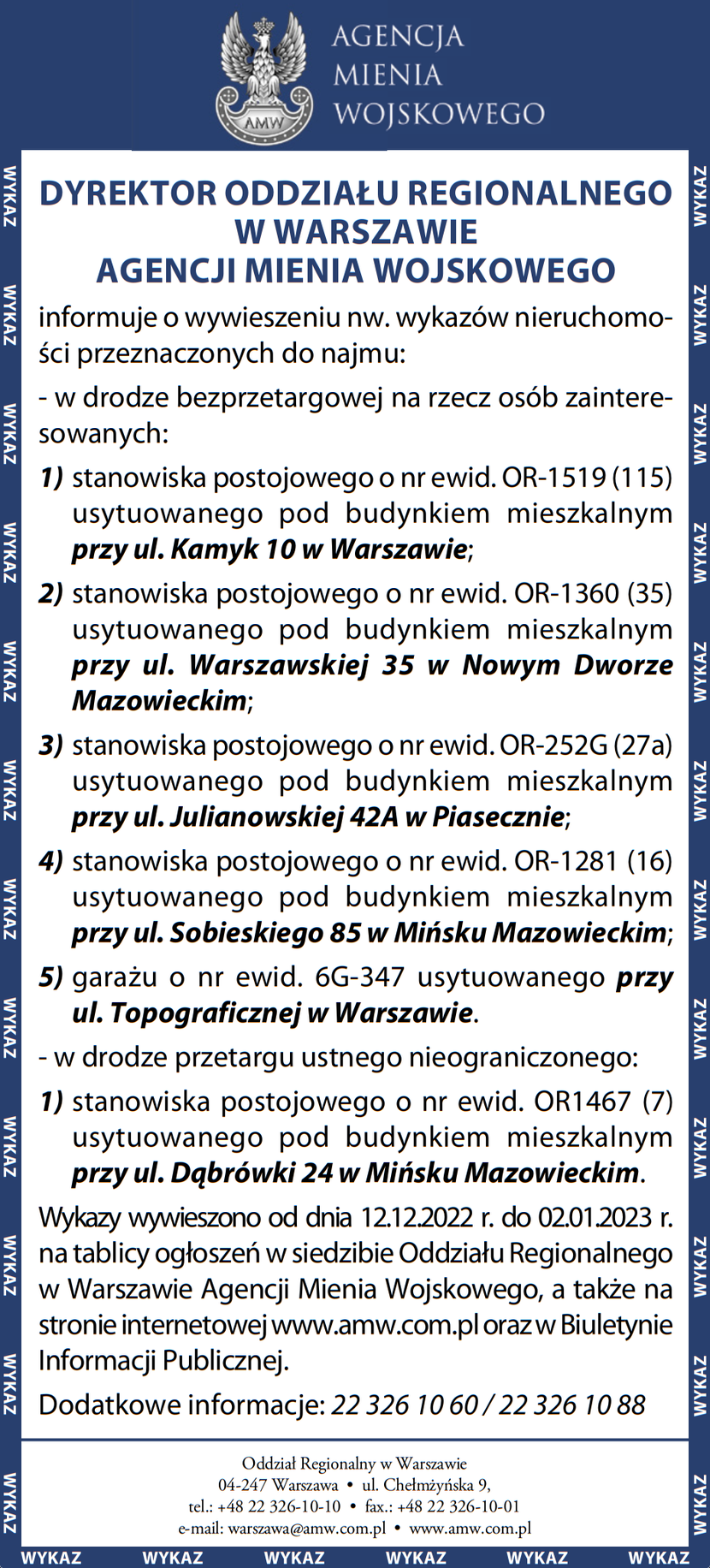 Dyrektor Oddziału Regionalnego AMW w Warszawie informuje o wywieszeniu wykazów nieruchomości przeznaczonych do najmu Komunikat partneraopublikowano: 2022-12-09 14:28PosłuchajZostań subskrybentemi słuchaj tego oraz wielu innych artykułów w pb.pl