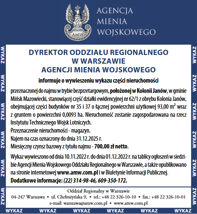 Dyrektor Oddziału Regionalnego AMW w Warszawie informuje o wywieszeniu wykazu nieruchomości przeznaczonej do najmu Komunikat partneraopublikowano: 2022-11-09 15:23PosłuchajZostań subskrybentemi słuchaj tego oraz wielu innych artykułów w pb.pl