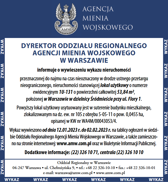 Dyrektor Oddziału Regionalnego AMW w Warszawie informuje o wywieszeniu wykazu nieruchomości przeznaczonej do najmu Komunikat partneraopublikowano: 2023-01-11 14:50PosłuchajZostań subskrybentemi słuchaj tego oraz wielu innych artykułów w pb.pl