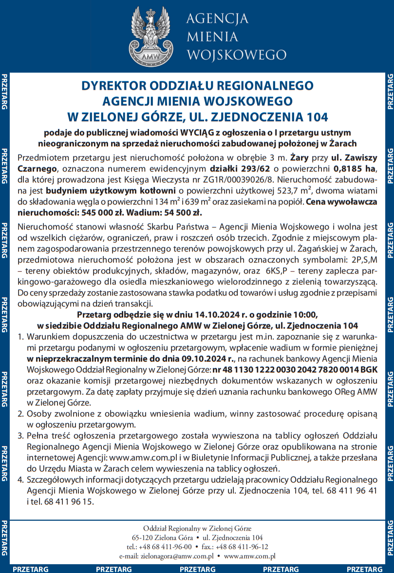 Dyrektor Oddziału Regionalnego AMW w Zielonej Górze podaje do publicznej wiadomości wyciąg Komunikat partneraopublikowano: 2024-08-13 08:48.PosłuchajZostań subskrybentemi słuchaj tego oraz wielu innych artykułów w pb.pl