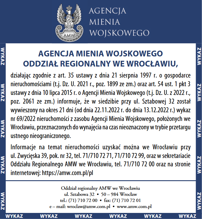 Dyrektor Oddziału Regionalnego AMW we Wrocławiu informuje, że na tablicy informacyjnej, wywieszony został wykaz Komunikat partneraopublikowano: 2022-11-21 12:42PosłuchajZostań subskrybentemi słuchaj tego oraz wielu innych artykułów w pb.pl