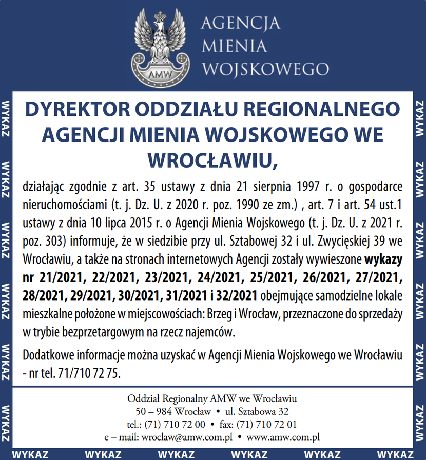 Dyrektor Oddziału Regionalnego AMW we Wrocławiu informuje że, zostały wywieszone wykazy nr 21/2021, 22/2021, 23/2021, 24/2021, 25/2021, 26/2021, 27/2021, 28/2021, 29/2021, 30/2021, 31/2021 i 32/2021 Komunikat partneraopublikowano: 2021-05-21 10:30