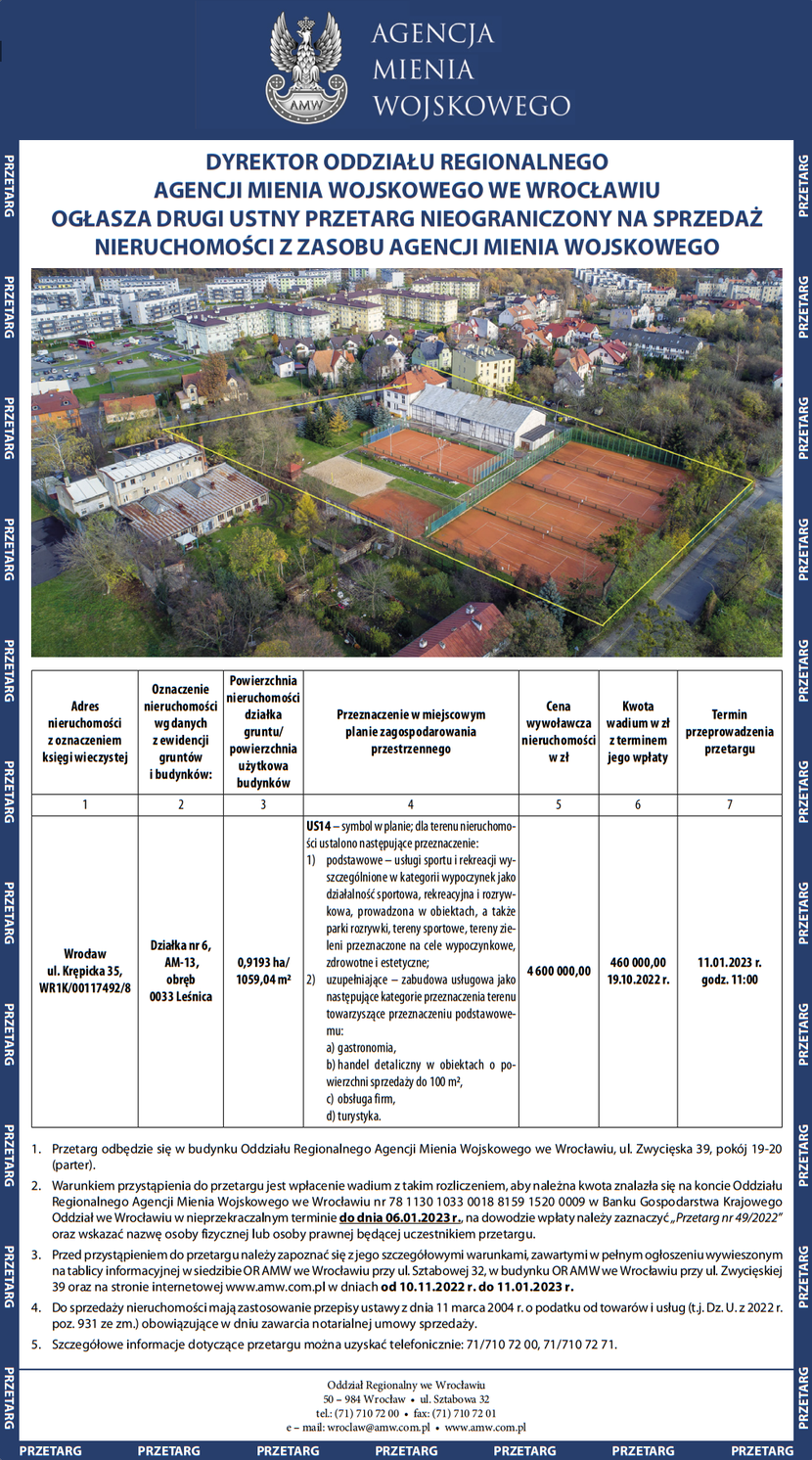 Dyrektor Oddziału Regionalnego AMW we Wrocławiu ogłasza drugi ustny przetarg nieograniczony na sprzedaż nieruchomości Komunikat partneraopublikowano: 2022-11-09 15:29PosłuchajZostań subskrybentemi słuchaj tego oraz wielu innych artykułów w pb.pl