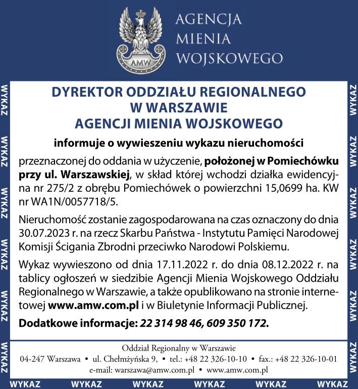 DYREKTOR ODDZIAŁU REGIONALNEGO W WARSZAWIE AGENCJI MIENIA WOJSKOWEGO Komunikat partneraopublikowano: 2022-11-16 13:48PosłuchajZostań subskrybentemi słuchaj tego oraz wielu innych artykułów w pb.pl