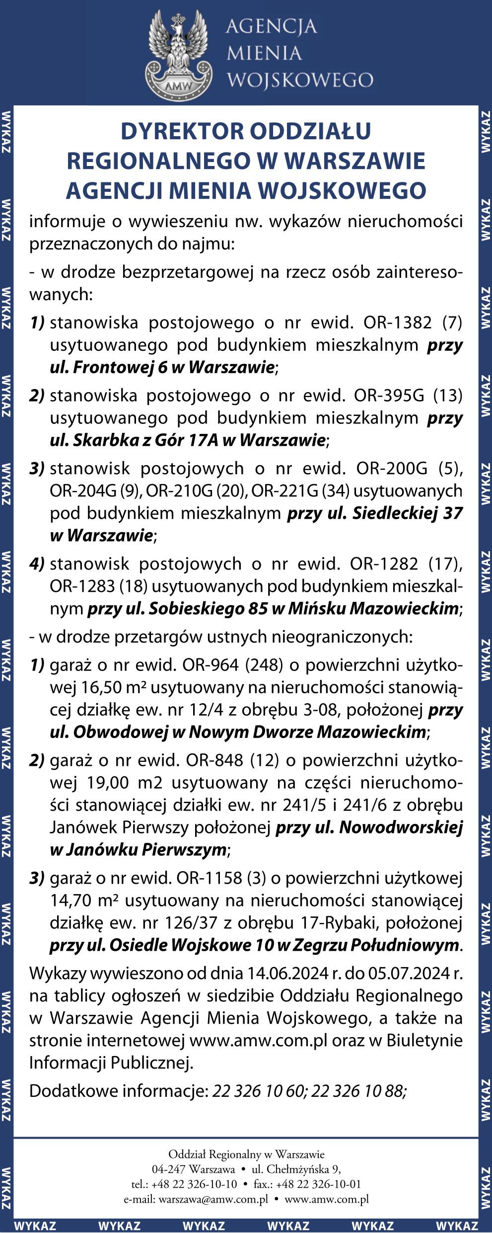 DYREKTOR ODDZIAŁU REGIONALNEGO W WARSZAWIE AGENCJI MIENIA WOJSKOWEGO Komunikat partneraopublikowano: 2024-06-13 14:32.PosłuchajZostań subskrybentemi słuchaj tego oraz wielu innych artykułów w pb.pl amw1306 amw1306