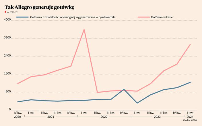 Allegro dysponuje obecnie największą kwotą w gotówce od finalizacji przejęcia czeskiego Mall Group w kwietniu 2022 r. Zarazem generuje znacznie lepsze przepływy gotówkowe niż wtedy, gdy dokonywało transakcji. Dwa lata temu kwartalny cash flow z działalności operacyjnej wynosił 430-470 mln zł. W czwartym kwartale 2023 r. sięgnął 999,9 mln zł i nie był to efekt sezonowy. Już trzy miesiące wcześniej cash flow z działalności operacyjnej przekroczył 910 mln zł, a w pierwszych trzech miesiącach 2024 r. osiągnął ponad 1,2 mld zł, a więc kwotę, na jaką zaledwie dwa lata temu Allegro musiałoby czekać trzy kwartały.