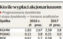 Zwłaszcza że minister energii Krzysztof Tchórzewski bez ogródek stwierdził, że dla dobra akcjonariuszy lepiej pieniądze przeznaczyć teraz na majątek PGE, a nie na dywidendę, „ponieważ mamy zawirowania na rynkach kapitałowych”, które mogą wpłynąć na koszt kapitału, niezbędny do sfinansowania inwestycji koncernu. Na razie konsens prognoz zakłada wypłatę przez spółkę 0,61 zł dywidendy na akcję z zysku za 2016 r. i 0,58 zł z zysku za 2017 r.