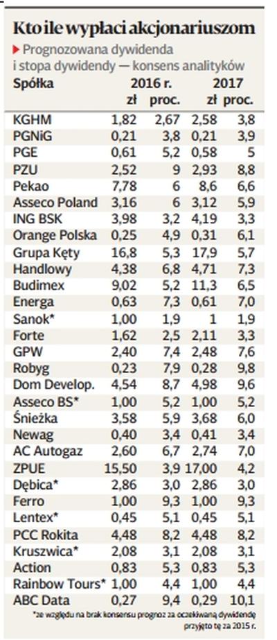 Wobec zapowiedzi reformy OFE dywidendowy blask może stracić Giełda Papierów Wartościowych, której zyski w ślad za spadającymi obrotami mogą nie być na tyle wysokie, by zaspokoić obecne oczekiwania rynku. W indeksie WIGdiv bez trudu można jednak znaleźć spółki prywatne, po których analitycy spodziewają się wysokich dywidend. Wśród najbardziej płynnych spółek wyróżniają się Pekao, Asseco Poland i Bank Handlowy, w drugim szeregu są choćby Kęty, Budimex, Robyg, Dom Development, Śnieżka czy PCC Rokita. W przypadku tej ostatniej (a także m.in. Lenteksu, Rainbow Tours i Asseco Business Solutions) analitycy nie przedstawili prognoz, ale biorąc pod uwagę sytuację finansową i dywidendową historię, można dość bezpiecznie przyjąć, że dywidendy za lata 2016 i 2017 będą co najmniej na zbliżonym poziomie jak ta za 2015 r. Większe wątpliwości można mieć natomiast co do wiarygodności konsensu prognoz dla takich spółek, jak Dębica (jej dywidenda spada od dwóch lat) oraz Action i ABC Data.