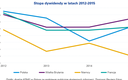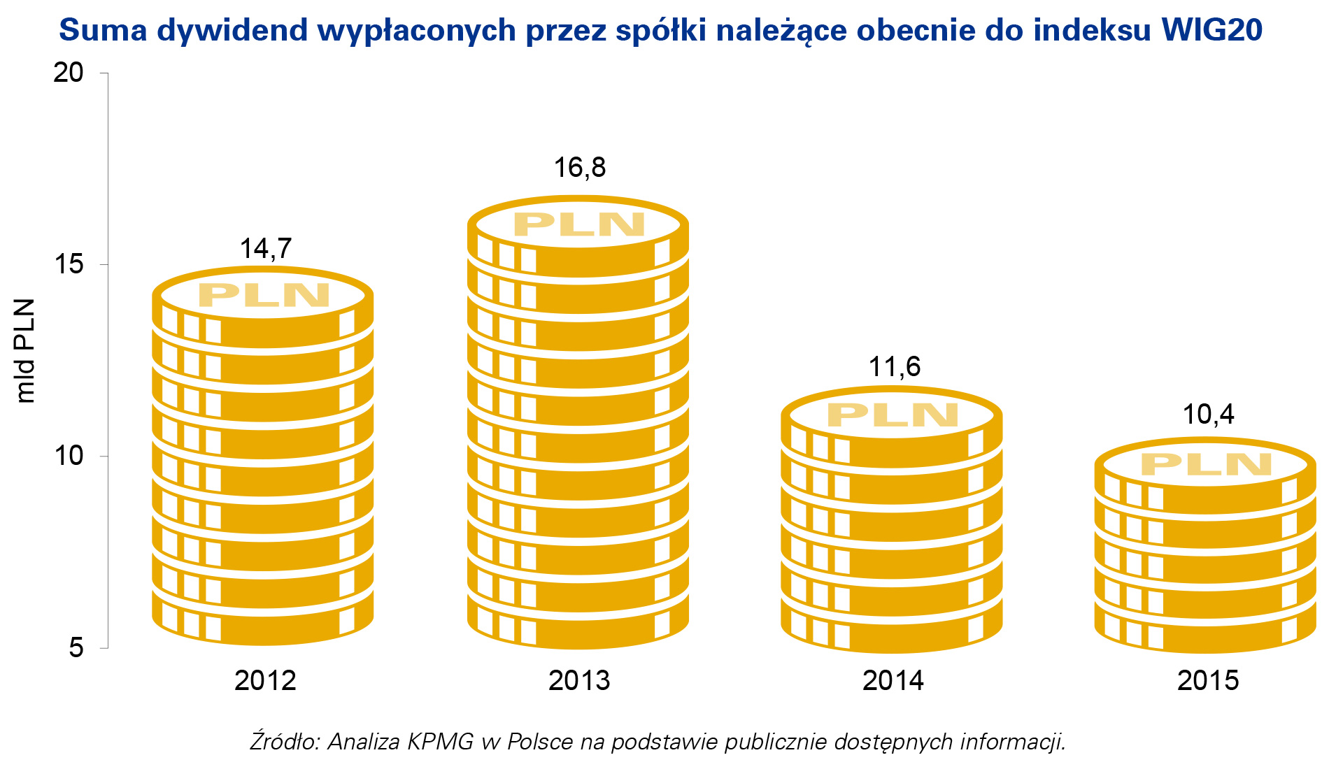 Do 30 czerwca 2016 roku odbyła się większość walnych zgromadzeń akcjonariuszy spółek giełdowych, na których zapadły ostateczne decyzje o podziale zysków za 2015 rok. Zgodnie z wyliczeniami KPMG w Polsce, 166 krajowych spółek z GPW wypłaci w sumie 16,8 mld zł, co w odniesieniu do ich kapitalizacji na koniec 2015 roku przekłada się na stopę dywidendy w wysokości 3,3%. Pomimo wzrostu liczby przedsiębiorstw dzielących się zyskiem, łączna wartość zadeklarowanych dywidend jest podobna jak przed rokiem (również 16,8 mld zł) oraz niższa niż w latach 2011-2013 (17,5 mld zł – 20,8 mld zł). Przyczyną spadku są cięcia dywidend wśród spółek należących do indeksu WIG20, które wypłacą z zysku za 2015 rok w sumie 10,4 mld zł, tj. o 11% mniej niż w ubiegłym roku i 21% poniżej poziomu z 2013 roku.