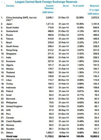 Deutsche Bank opracował ranking rezerw walutowych banków centralnych. Polska zajęła 20 miejsce. Wyprzedza m.in. Wielką Brytanię, Szwecję czy Zjednoczone Emiraty Arabskie.