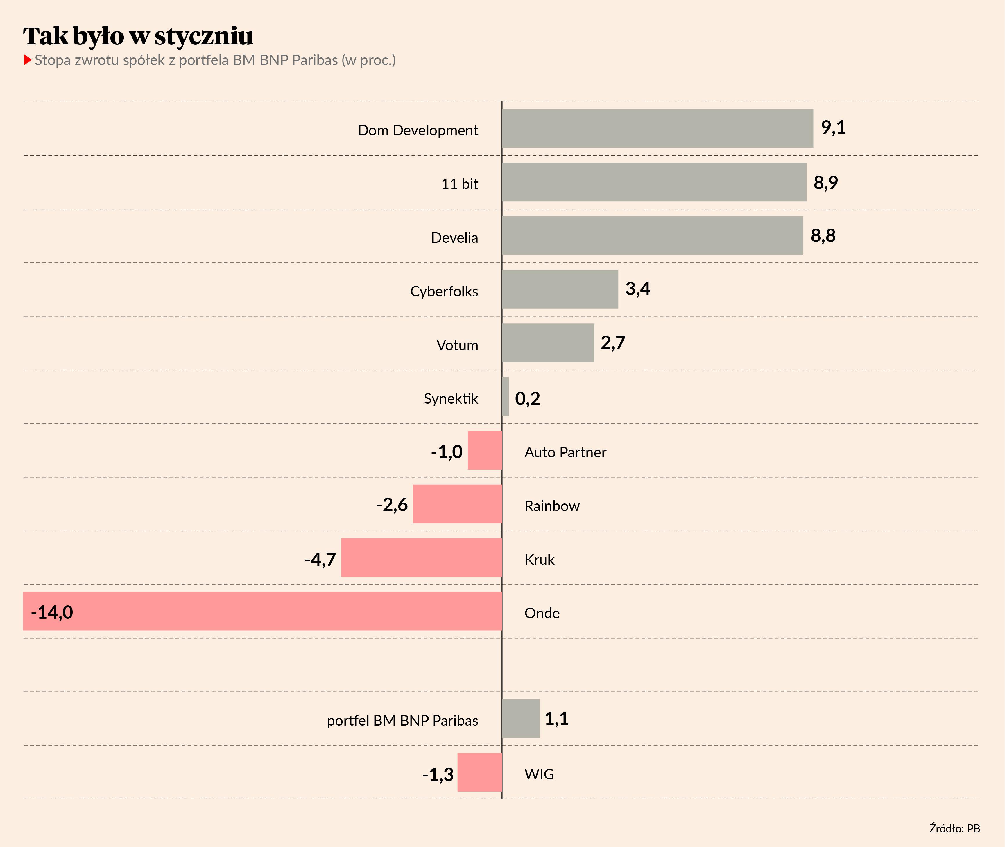 Akcje Kruka w ostatnich tygodniach dotknęła jednak korekta - w portfelu BM BNP Paribas na styczeń gorszą stopę zwrotu niż windykator przyniosły tylko walory Onde.