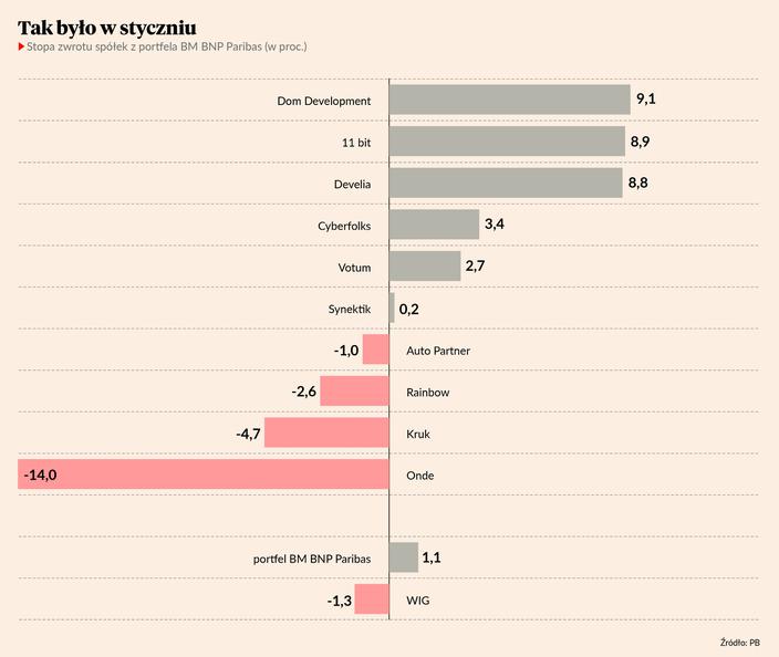 O 14 proc. potaniały w styczniu akcje Onde, jednego z bohaterów okołowyborczej hossy (od 15 października do końca roku podrożały o 47 proc.). Korekta skłoniła ekspertów biura maklerskiego do realizacji zysków - od momentu pojawienia się w portfelu na początku grudnia notowania urosły o 27 proc.
